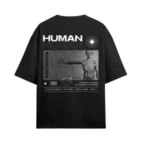 Make a statement with the Be Human Oversized Tee — a thought-provoking streetwear piece that blends minimalism with impactful art. Featuring a clean front text print and an intricate back composition inspired by Da Vinci’s Vitruvian Man, this design challenges us to reflect on humanity’s role in shaping the future.